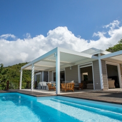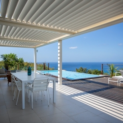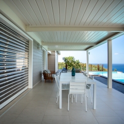 Elle comprend : nos Volets Roulants Cristal Vision transparents, à la fois innovants et haut de gamme, conçus pour allier esthétisme, sécurité et confort. La Pergola Bioclimatique à lames, parallèles à la facade, qui s’ouvrent et se referment grace à une motorisation SOMFY RTS, offrant ainsi un confort optimal. Et enfin des Jalousies Security Aluminium à lames ventilantes, une nouvelle génération de jalousies, plus sécuritaires et parfaitement adaptées aux exigences climatiques ultramarines.